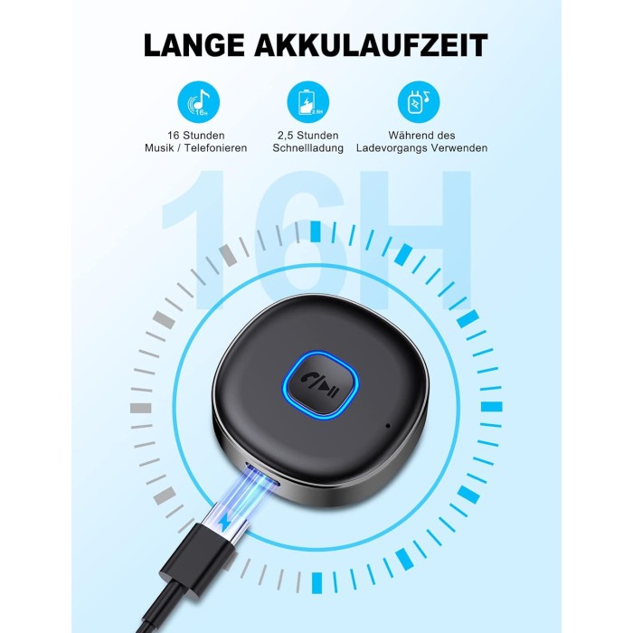 - Lange Spielzeit für ununterbrochenen Musikgenuss: Mit bis zu 16 Stunden Akkulaufzeit bist du für jede Reise gerüstet! Das inklusive Type-C-Schnellladekabel ermöglicht eine vollständige Aufladung in nur 2,5 Stunden. Der Bluetooth Adapter Aux kann sogar während des Ladevorgangs verwendet werden – perfektioniere dein Hörerlebnis, wann immer du willst!