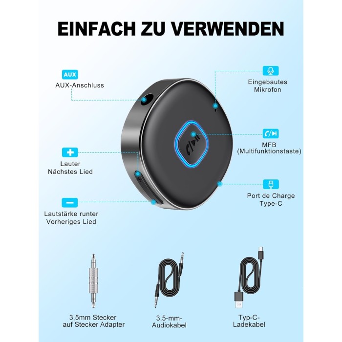- Sicher und Bequem Unterwegs: Bleibe während der Fahrt vollkommen sicher mit unserer Freisprecheinrichtung für Auto! Mit dem integrierten Mikrofon kannst du freihändig telefonieren und einfach per „MFB“-Taste Anrufe annehmen oder ablehnen. Außerdem unterstützt unser Bluetooth Aux Adapter Sprachansagen deiner Navigations-Apps, damit du stets den Überblick behältst, ohne vom Straßenverkehr abgelenkt zu werden.