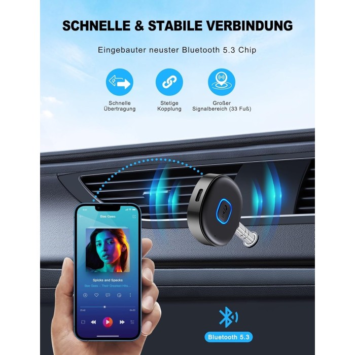 - Neueste Bluetooth 5.3-Technologie: Erlebe die fortschrittliche Bluetooth 5.3-Technologie mit superschnellen Übertragungsraten und einer stabilen Verbindung. Unser Auto Bluetooth Adapter unterstützt die gleichzeitige Verbindung von zwei Geräten – wechsle mühelos zwischen deinem Handy und deinem Tablet, ohne das Streaming zu unterbrechen!