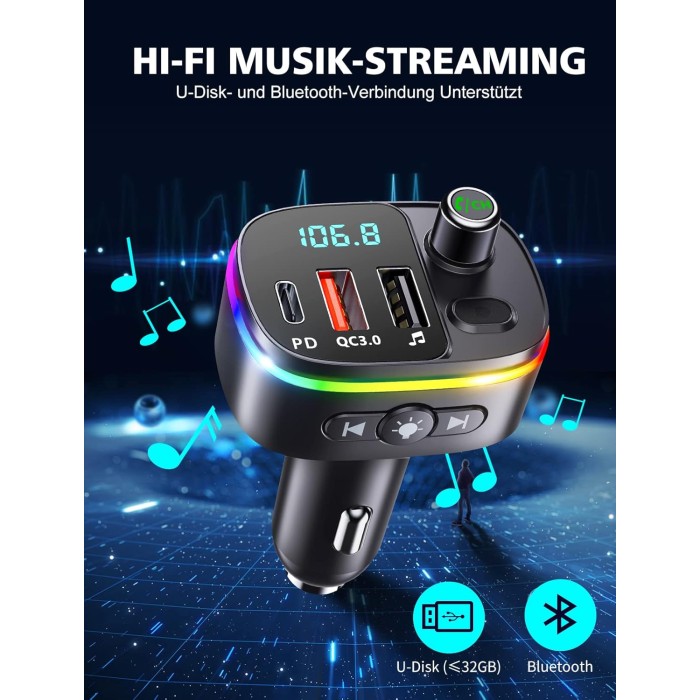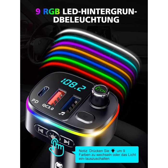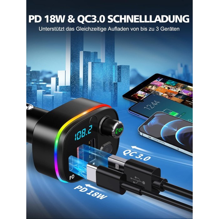 Mohard Bluetooth Adapter Auto, PD 18W&QC3.0 FM Transmitter Auto, 9 RGB Beleuchtungsmodi, 3 USB Anschlüss Auto Ladegerät, Unterstützt Freisprechfunktion, Siri Assistant, USB-Disk, Patchkabel-Adapter