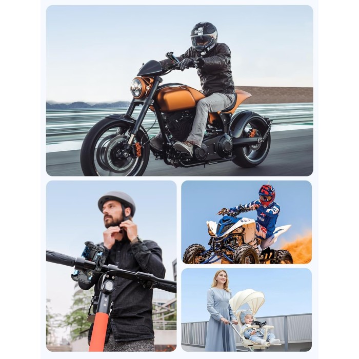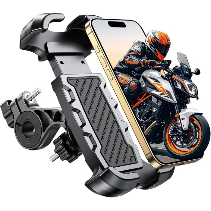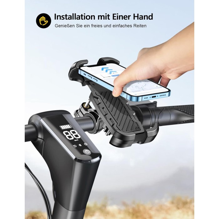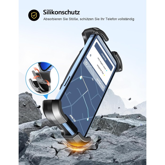 - [Silikonschutz - Kratzfest]: Vier rutschfeste Silikonkissen und ein Silikonpad auf der Rückseite, die Ihr Smartphone vollständig umhüllen, schützt diese Motorrad Handyhalterung Ihr Smartphone vor Kratzern und Vibrationen.
