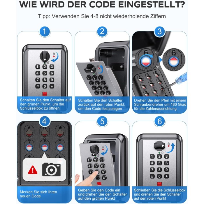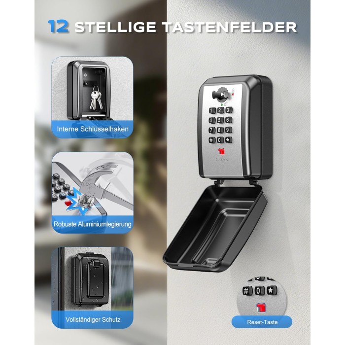 - 【12-stellige Anpassbare Sicherheit】 Erleben Sie maßgeschneiderte Sicherheit mit unserem 12-stelligen Schlüsseltresor! Personalisieren Sie Ihren exklusiven Zugangscode aus Tausenden von Optionen. Die größeren Zifferntasten sorgen zudem für gute Lesbarkeit für Nutzer jeden Alters. Profi-Tipp: Für optimale Sicherheit und Einprägsamkeit empfehlen wir 4–8 Ziffern. Notieren oder fotografieren Sie Ihren Code nach jeder Einstellung, um eine Aussperrung zu vermeiden.