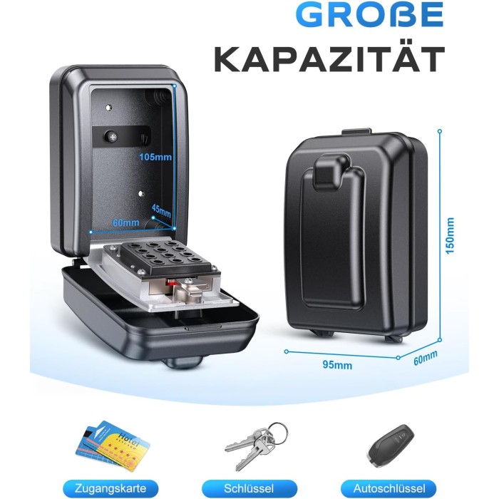 - 【Geräumige Schlüsselaufbewahrung】 Mit einem großzügigen Innenraum (10.5 x 6.0 x 4.5cm) bietet dieser Schlüsselsafe mit Code sicheren Platz für mehrere Standardschlüssel, Autoschlüssel und Zugangskarten. Integrierte Haken sorgen für Ordnung und verhindern ein Verrutschen der Standardschlüssel. Die große Öffnung ermöglicht einfachen Zugriff und ist somit ideal für Hausverwalter, Gastgeber oder Familien, die ihre Schlüssel geordnet aufbewahren möchten.