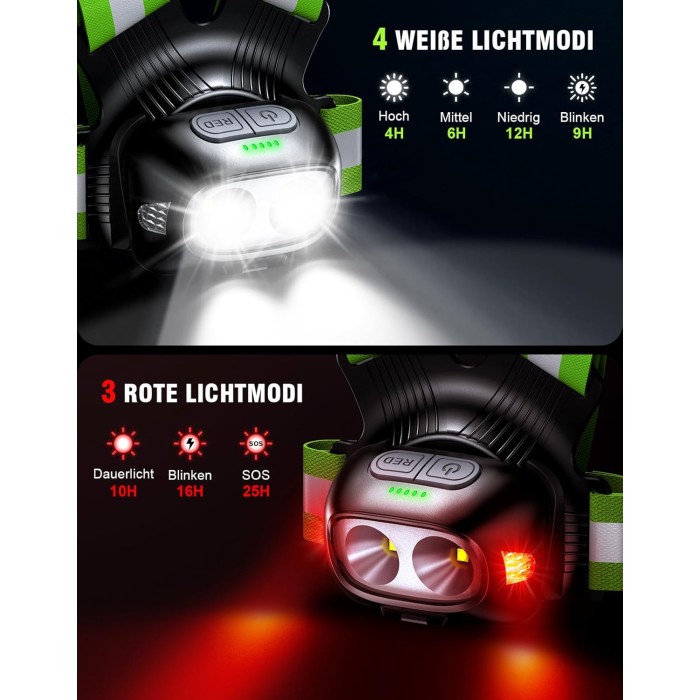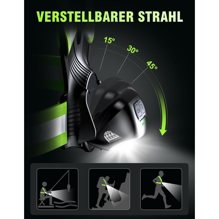 - 【7 Lichtmodi & Mehrwinkel】Die Lauflicht Joggen bietet 7 Beleuchtungsmodi, darunter 4 weiße Lichtmodi (Hoch / Mittel / Niedrig / Blinken) und 3 rote Lichtmodi (Dauerlicht / Blinken / SOS), um den Anforderungen verschiedener Szenarien gerecht zu werden. Das vordere Brustlampe zum Joggen unterstützt eine Mehrwinkelverstellung von 45° (15° / 30° / 45°), um eine präzise Steuerung des Beleuchtungswinkels für die Abdeckung von nahen und fernen Entfernungen zu ermöglichen.