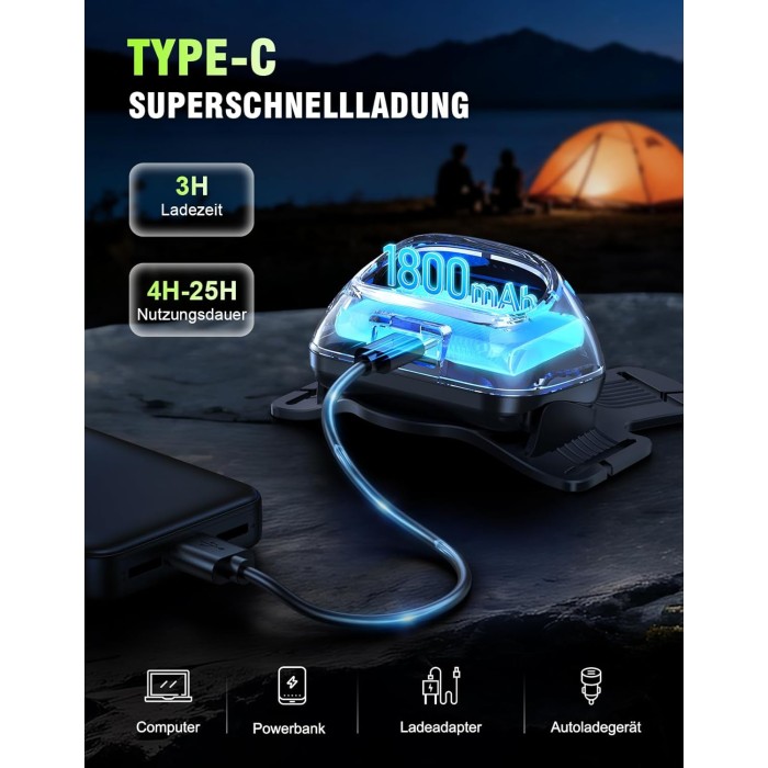 - 【Lange Akkulaufzeit & Akkuanzeige】Mit einem Type-C wiederaufladbaren 1800mAh-Akku bietet unsere Jogging Lampe Brust einer schnellen 3-stündigen Aufladung 4-25 Stunden Beleuchtung. 5-Stufen-Anzeigeleuchten erinnern Sie daran, wann Sie das Licht aufladen müssen - machen Sie sich nie Sorgen, dass der Akku leer wird. Ideal für Langstreckenläufe.