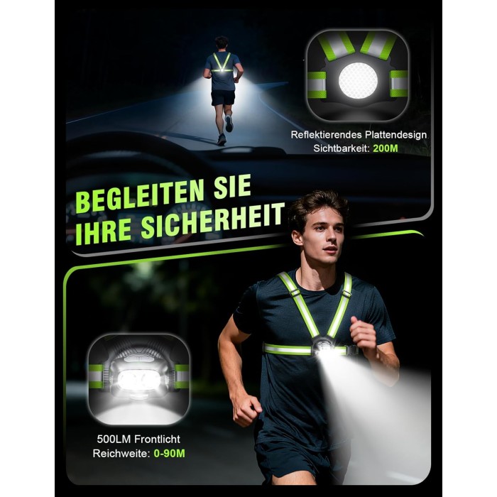 Mohard Lauflampe Joggen, 500 Lumen Lauflicht, 1800mAh Wiederaufladbare Brustlampe zum Joggen, 7 Modi, 45° Verstellbar & IPX4 Wasserdicht Running Light mit 360° Reflektor Weste für Nachtlauf, Wandern
