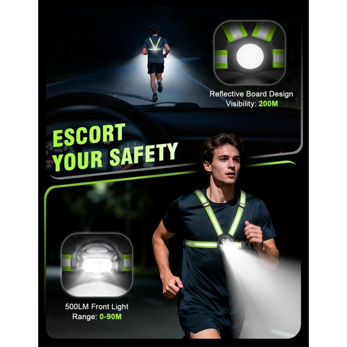 Mohard Running Lights for Runners, 500LM Rechargeable Running Chest Light with 7 Modes & 45° Adjustable Beam, IPX4 Waterproof 360° Reflective Running Vest, Body Torch for Night Walking/Jogging/Hiking