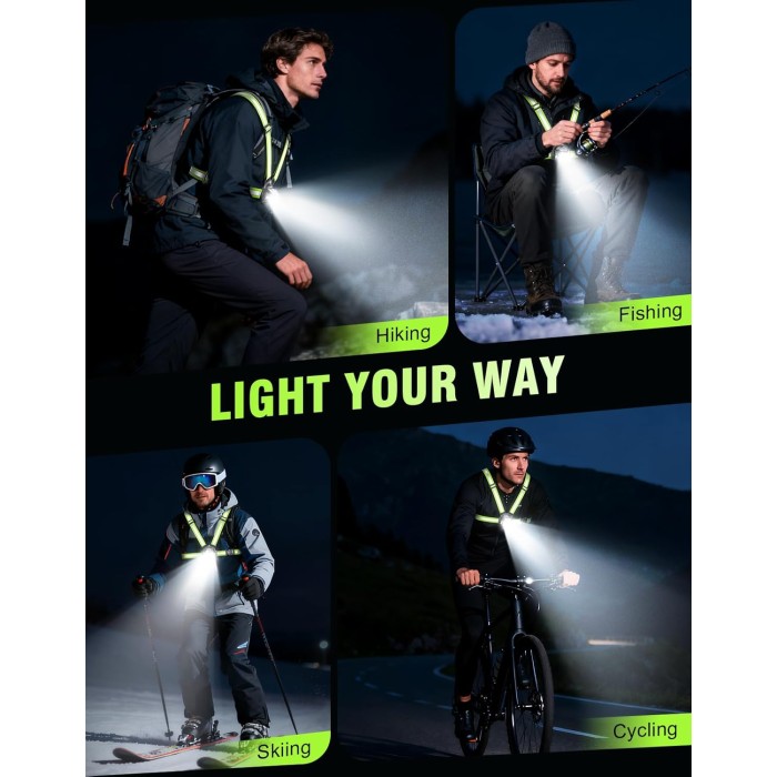 - 【IPX4 Waterproof for Multi-Scene】With an IPX4 waterproof rating and rugged design, this chest torch for running repels rain, making it reliable for a wide range of scenes, from dawn jogs to night rides. It's not only an excellent running light vest, but also a great choice for camping, cycling, fishing, hiking, and emergency kits.